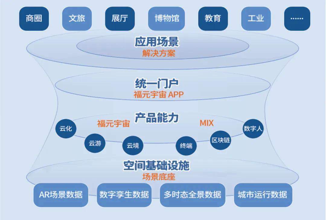 與之相對應的,“福元宇宙”的產品體系被分為四層:最底層是大數據構成的空間基礎設施;第二層是華為雲河圖KooMap的大場景AR能力、數字孿生能力、數字人、終端等組成的產品能力;第三層是福元宇宙APP承載的“統一門户”;最上層是商圈、文旅、展廳、教育、工業等各種各樣的應用場景。