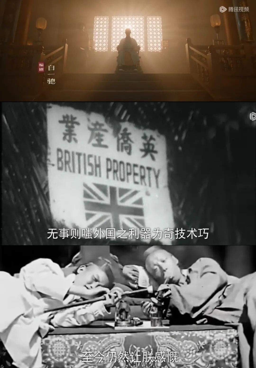 畫面是黑白閃回的晚清屈辱歷史、歷史課本見到的百姓吸大煙情景、底層人民的生活……
