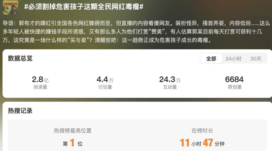 5月21日,#必須割掉危害孩子這顆全民網紅毒瘤#的話題迅速登頂微博熱搜,漫天的輿論聲中,郭有才站在漩渦中心,他不再被視為勵志典範,而是荼毒青少年的罪魁禍首,是全民網紅時代的導火索。