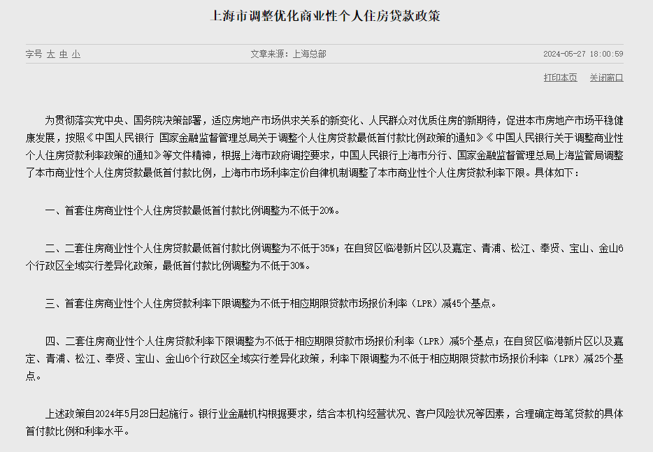 5月27日,上海發佈兩則住房優化新政,涉及降低購房門檻、最低首付款比例和住房貸款利率。其中,購房要求上,下調非滬籍居民家庭以及單身人士購房繳納社保或個人所得税的年限為3年及以上。