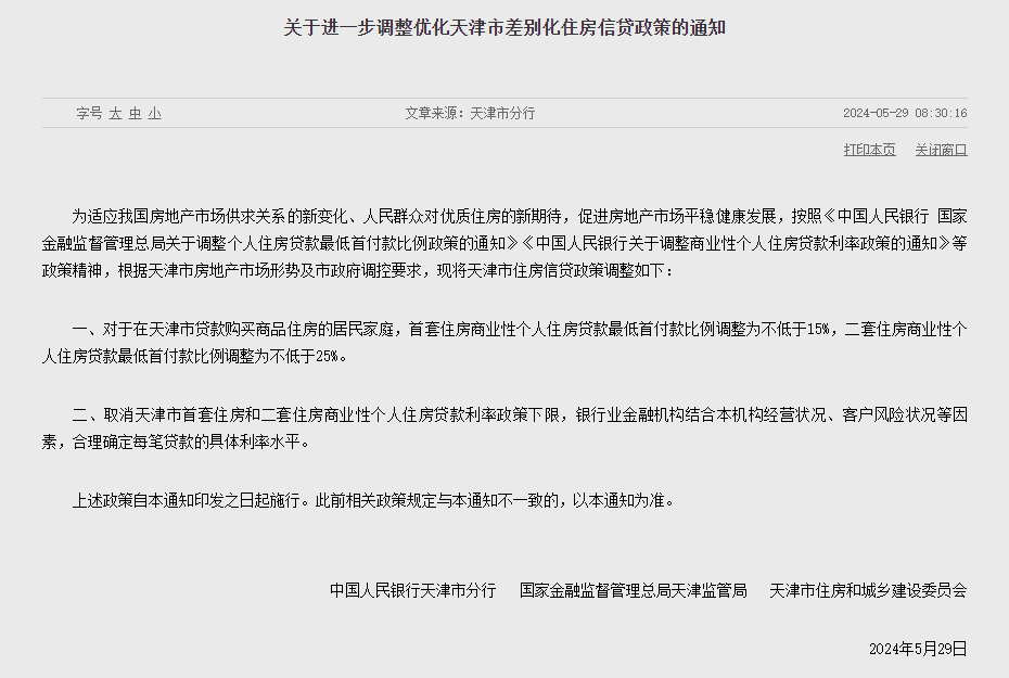 5月29日早上,天津住建委聯合多部門發佈了《關於進一步調整優化天津市差別化住房信貸政策的通知》,將首套住房首付款比例調整為15%,二套住房最低首付款比例調整為25%,同時取消首套、二套住房商業貸款利率下限。