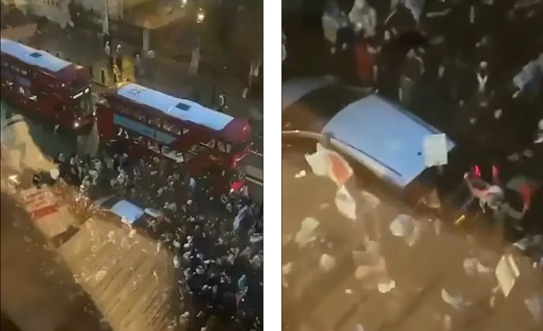 社交媒體上流傳的視頻畫面顯示,繼續留在現場抗議的人羣隨後在唐寧街外與警方發生衝突,他們佔領了議會附近的街道、砸碎汽車玻璃,圍攻雙層巴士。