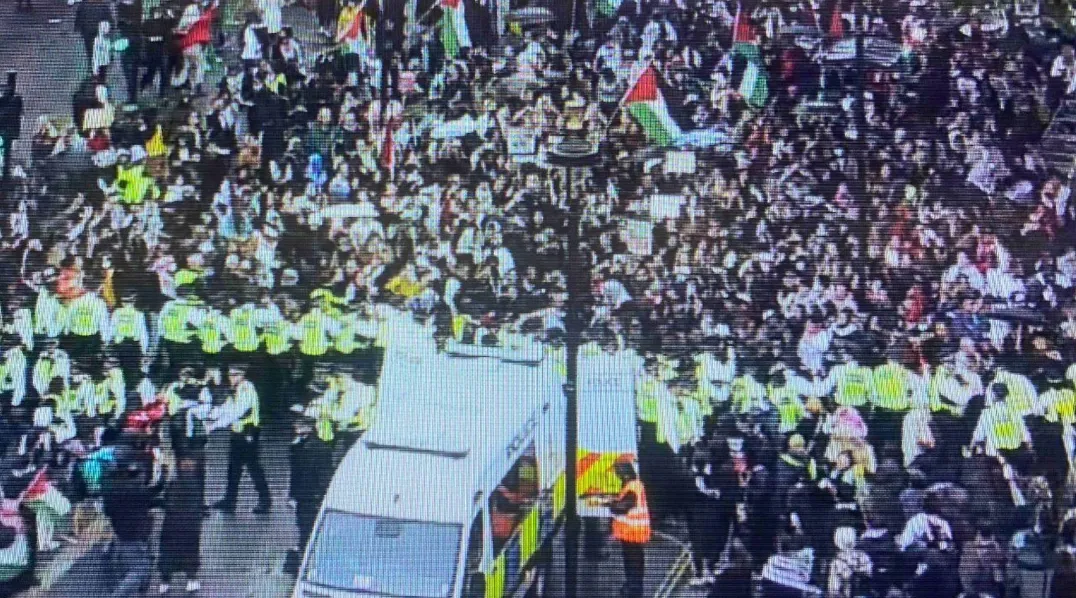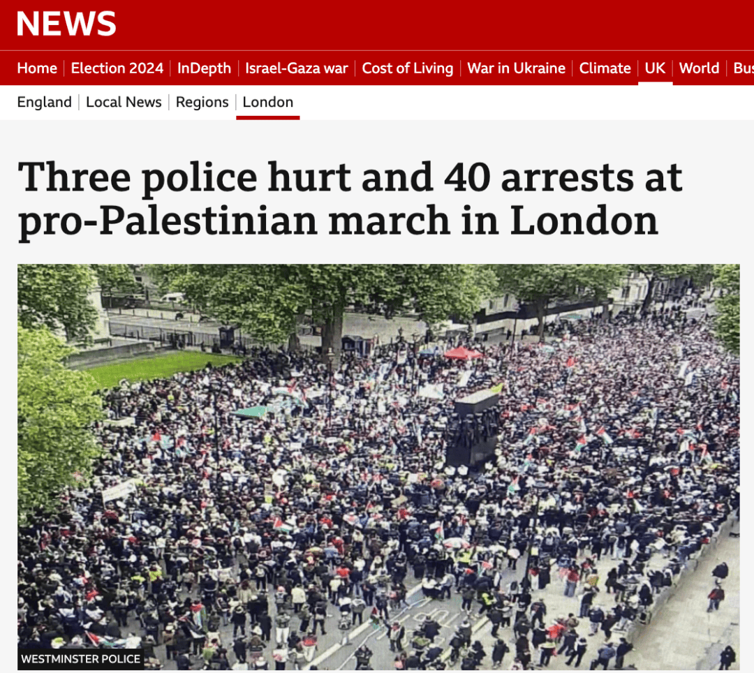 綜合多家英媒報道,昨日晚間,包括“巴勒斯坦團結運動組織”在內的多個團體,在威斯敏斯特白廳聯合組織了一場大規模抗議活動。
