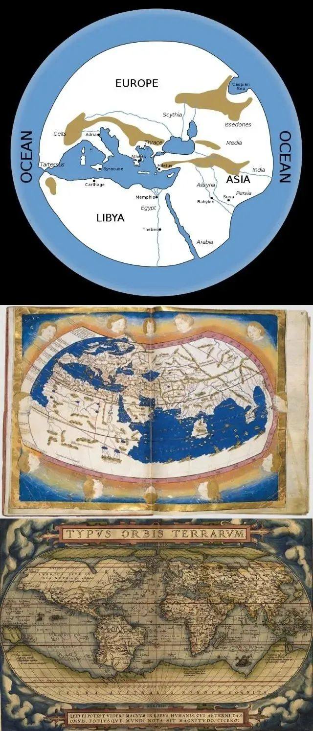 圖:從上至下,依次為古希臘時代、公元150年、1570年曆代世界地圖對比