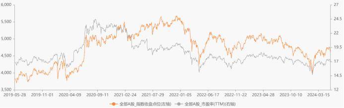 圖:五年間A股估值、點位趨勢,來源:Choice金融客户端