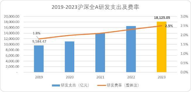 與三費出現明顯背離的另一項指標是,滬深全A的研發支出五年內增長了將近一倍,費率也從1.8%增長至2.5%。