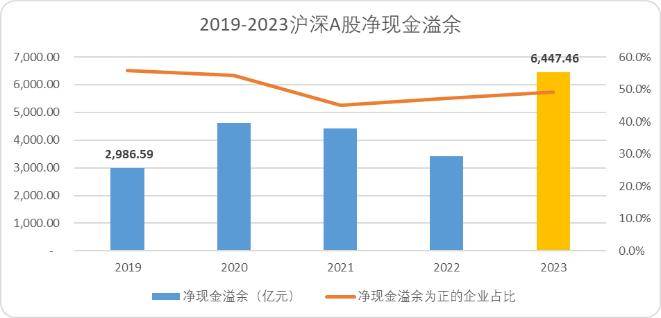 2023年滬深A股整體的淨現金溢餘較2019增長一倍有餘,表面上看錶現十分優異,但如果我們從結構層面來看, 2023年淨現金溢餘為正的企業佔整體上市企業的比重還不足一半,也低於五年前的水平。