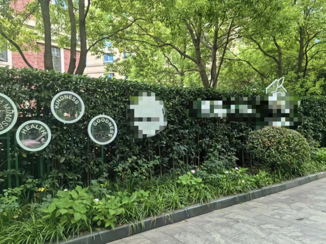 別的幼兒園一般都有個那種大門對吧,然後門上寫了幾個大字“XXX幼兒園”。這家沒有,這家你甚至很難找到大門還有招牌。我最後還是在圍牆的綠植裏找到了一個小小的招牌。