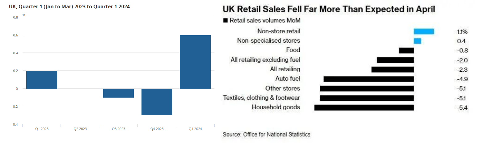 第二個原因,就是經濟了。今年上半年,英國經濟稍微好點了,4月通脹率降到了2.3%,是三年來最低的,比蘇納克剛上任時的11%,要好上很多。第一季度的GDP止跌回升,環比漲了0.6%,也是兩年半來表現最佳,舉國同喜啊。然而,5月24日的最新數據,又不太好了,零售跌的比較厲害,而且經合組織給的經濟預期也不好。總而言之,英國經濟是剛見起色,就達到巔峯,下半年又是個大熊市。如果現在選,還能沾點上半年經濟的光,勝率還大一點。
