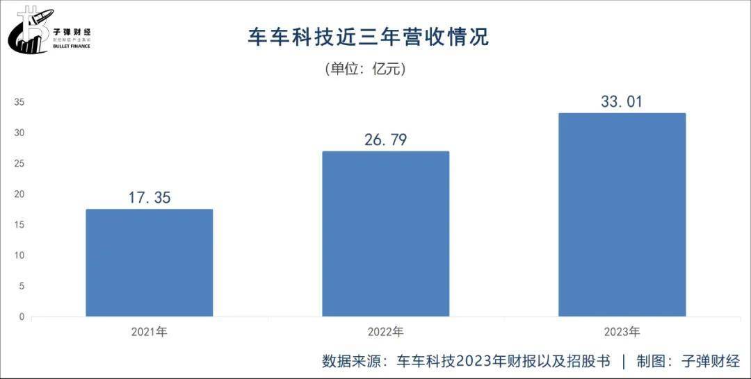 淨營業收入方面,2021年至2023年,車車科技分別實現營收17.35億元、26.79億元及33.01億元,2022年和2023年同比增長分別為54.4%、23.2%。