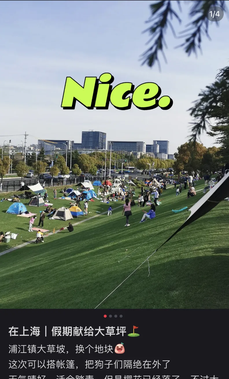 “在上海,別人都擠在公園裏安營紮寨,你卻躺在綠化帶裏安之若素,這才是真鬆弛。帶塊野餐墊,拿個小音響,音樂一放,就能感受到滬上真正的底色,其實是平和。”