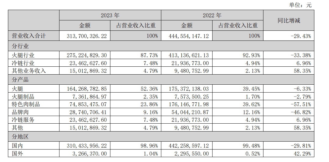 2023年,金字火腿的特色肉製品(包含了香腸、臘肉、醬肉、淡鹹肉等產品)的銷量還不及上年的一半,收入則下滑了57.51%,在總營收的佔比降至2成。這也拖累了金字火腿整體業績表現。去年,金字火腿的營收和淨利潤分別下滑了29.43%、18.29%。