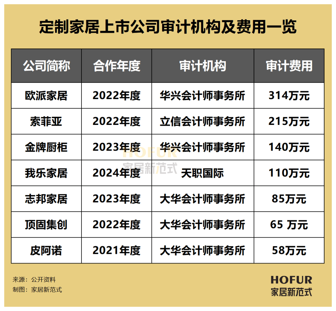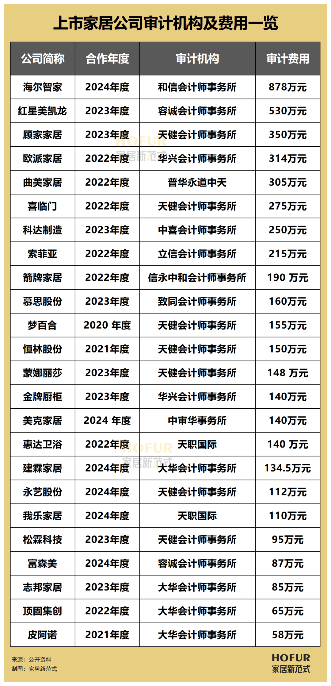 審計費用上,根據各上市公司的業務規模、審計具體要求、範圍、會計處理複雜程度等因素,費用不一。家居新範式統計了部分企業最近年度裏的審計詳細費用: