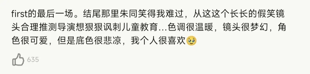 在影片的結尾,朱同因為能參加比賽開心的笑着,是被老師要求的開心的笑。