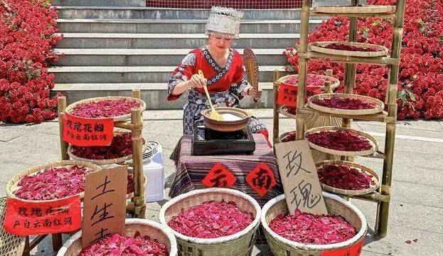 幾天前,在滇牛雲南酸菜牛肉火鍋(成都科華旗艦店),店前大秀浪漫,門店把玫瑰鮮奶米布的製作搬到了店外,加上一筐筐雲南紅河玫瑰花瓣,把區域甜品進行展示。