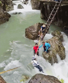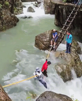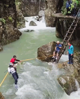 正扶着繩子試圖踩石頭過溪