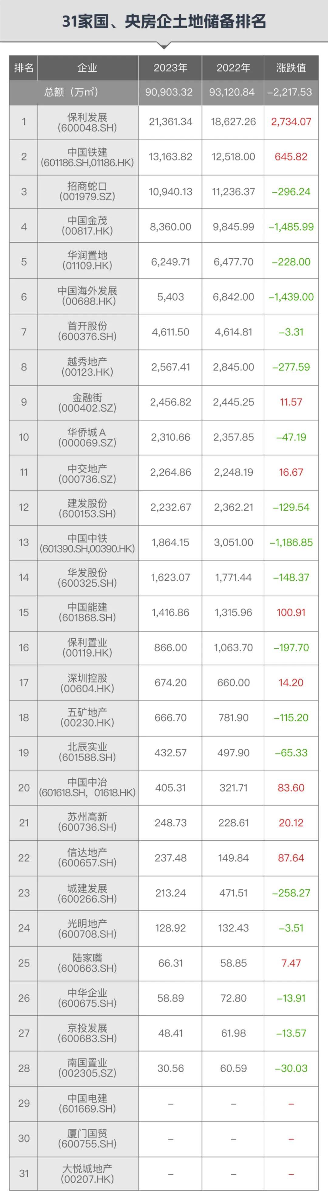 雖然國、央房企成了土地市場上的主角,拿地佔比不斷提升,但整體土地市場仍處於下行趨勢。31家國、央房企2023年合計土地儲備為90,903.32萬㎡,同比減少超過2200萬㎡。