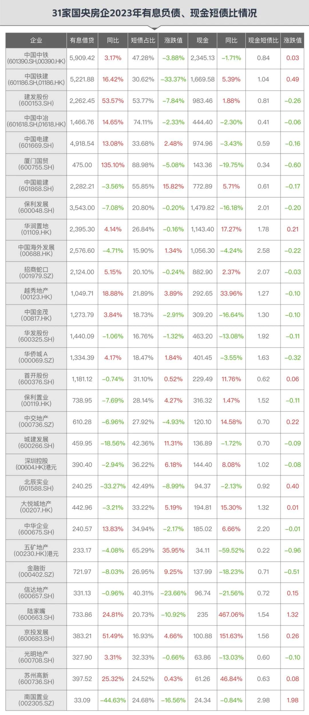 具體來看,2023年現金短債比前三名房企為南國置業(002305.SZ)、中華企業(600675.SH)和中海地產,末三名為五礦地產(00230.HK)、廈門國貿(600755.SH)和中國中冶(601618.SH,01618.HK)。