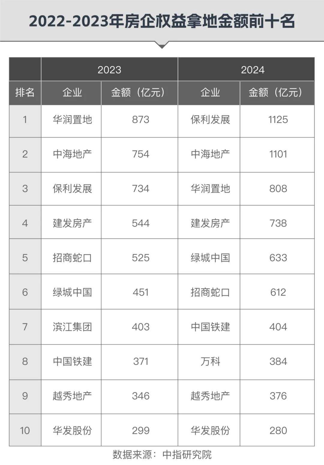 其中,保利、中海、華潤連續兩年包攬了權益拿地面積前三名,總投資金額分別為1859億元(人民幣,下同)、1855億元和1681億元。