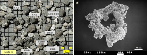 (a)阿波羅11號月壤中大顆粒物(2~4 mm)的照片(https://sites.wustl.edu/meteoritesite/items/lunar-regolith-breccias-and-fragmental-breccias/);