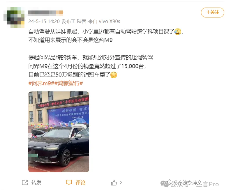 接着看宣講內容,賽力斯的課堂宣講條幅中有“全景智慧問界M9”,以及在學校門口擺放了兩台車,多少有點廣告嫌疑。