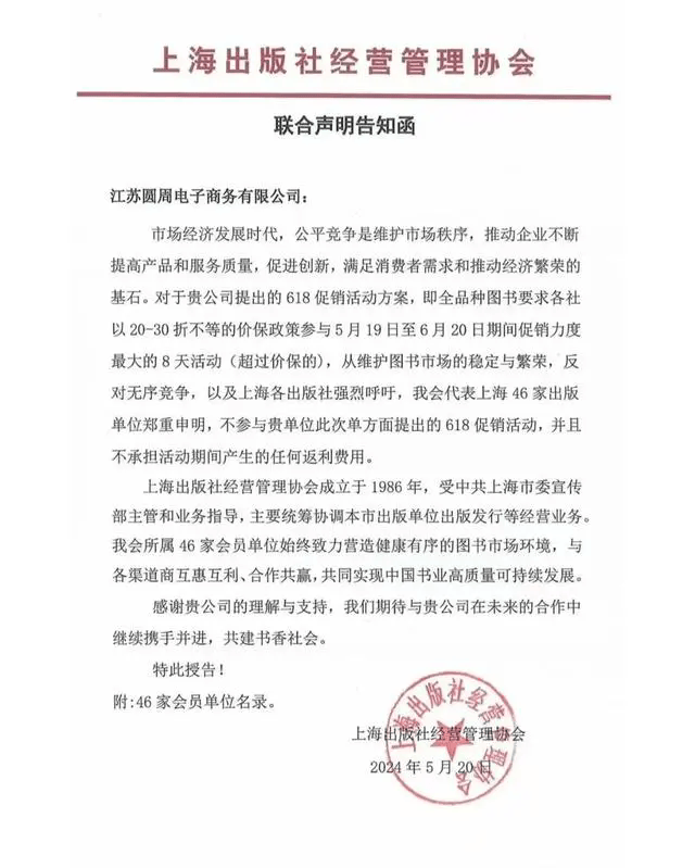 更早一些的時候,包括北大出版社、人大出版社、清華出版社等在內的北京“八社聯合”告知函,以及上海出版社經營管理協會代表上海46家出版社發出告知函,已經在網上廣為流傳。