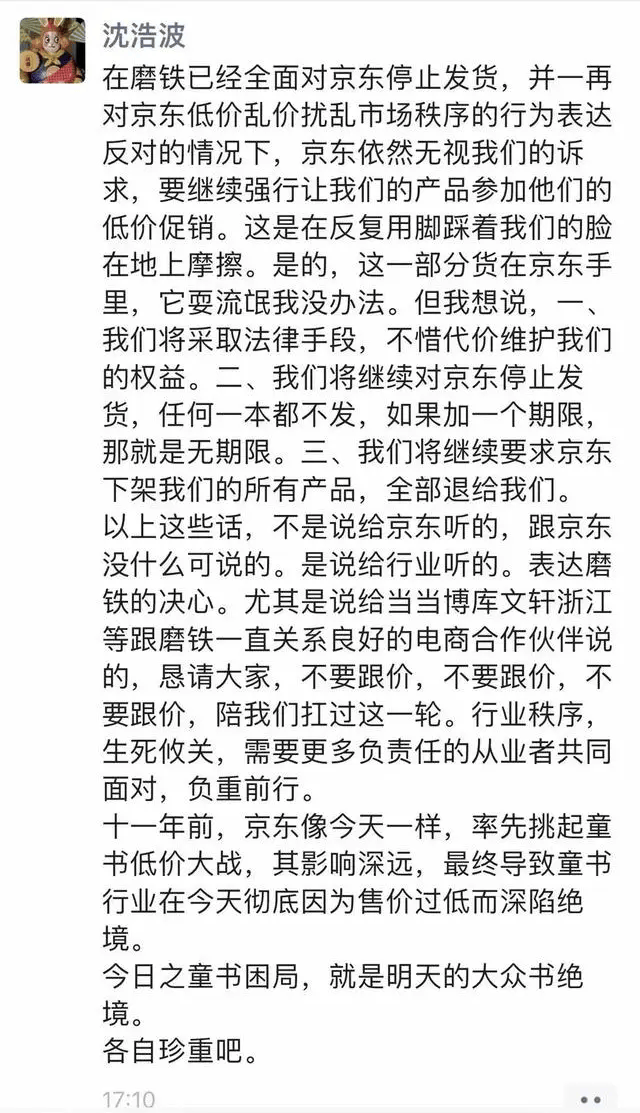 也正是在這一天,北京磨鐵圖書創始人沈浩波朋友圈發文稱,抵制京東的低價促銷,全面對京東停止發貨,要求京東下架所有產品。