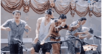 因為遊戲一直失敗,兄弟們被水噴到全身濕透。鄧超索性開玩笑:有沒有沐浴液,順便把澡洗了。