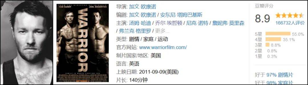 他的代表作《勇士》,豆瓣16萬人打出8.9的高分。