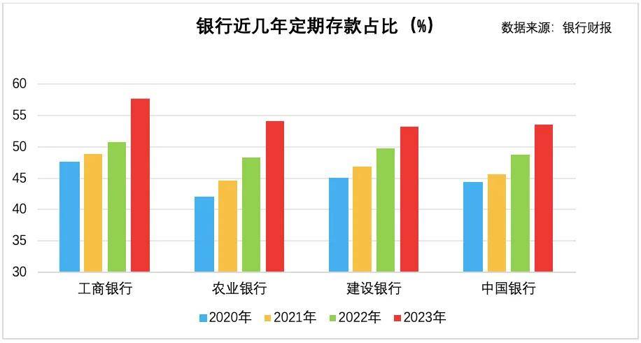 2023年,工、農、建、中四大行的定期存款佔比分別為57.65%、54.1%、53.16%、53.5%,比2022年擴大6.94個百分點、5.67個百分點、3.9個百分點、4.76個百分點。