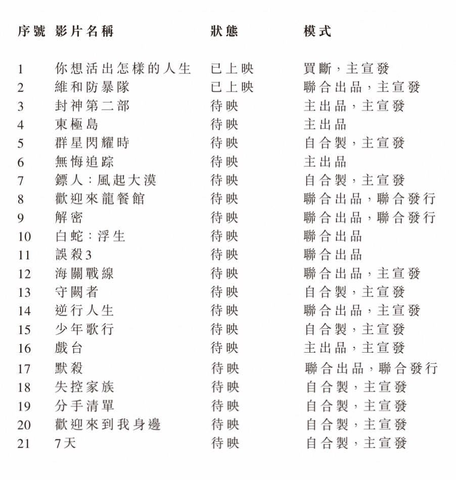 **穩定的業務節奏,是阿里影業的主要亮點。**它並不拘泥於特定的內容生產模式,而是廣泛參與好項目,覆蓋重點檔期和重點人羣。在行業熱度持續走高、好項目層出不窮的情況下,阿里影業在報告期內參與出品、發行的總影片數量逾60部,其中15部進入同期票房前20,面對去年接近13億人次觀影的大盤,抓住不同品類的優質內容,可以用合理的參與模式撬動更大的成果,並取得了高於行業的投資回報,可見其策略行之有效,初步形成內容領先姿態。