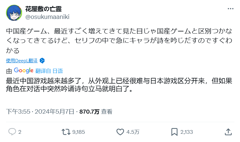 相當一部分國產二遊選用的也是市面上常見的日系畫風,再加上日語本就存在大量與中文互通的漢字,照這麼看,日本玩家應該是除中國玩家之外最能理解國產二遊的羣體。
