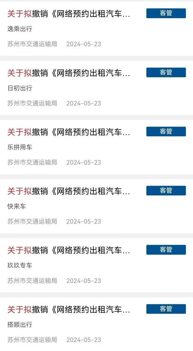 5月17日,蘇州發佈公告擬撤銷逸乘出行、日初出行、樂拼用車、快來車、玖玖專車等7家網約車平台的經營資質,這些網約車平台都是在執法檢查中發現,不具備線下服務能力。