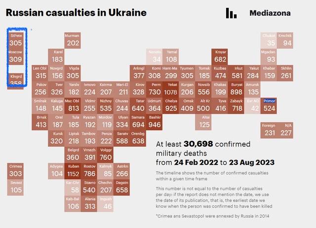 位於遠東的布里亞特、外貝加爾以及濱海邊疆區的陣亡人數,分別為898、718和524人,庫班、雅庫特的陣亡人數都超過了1000人,而我圈起來的部分,莫斯科和聖彼得堡的數據都是300人出頭。即便説來自大城市的兵源素質高,所以戰場生存率也高,我想也不至於差距這樣大吧。