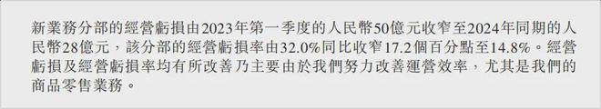 隨着商品零售業務的效率大幅改善,新業務分部一季度收入同比增長18.5%至人民幣187億元,經營虧損相較去年同期減少34.2億,同比收窄40.5%。