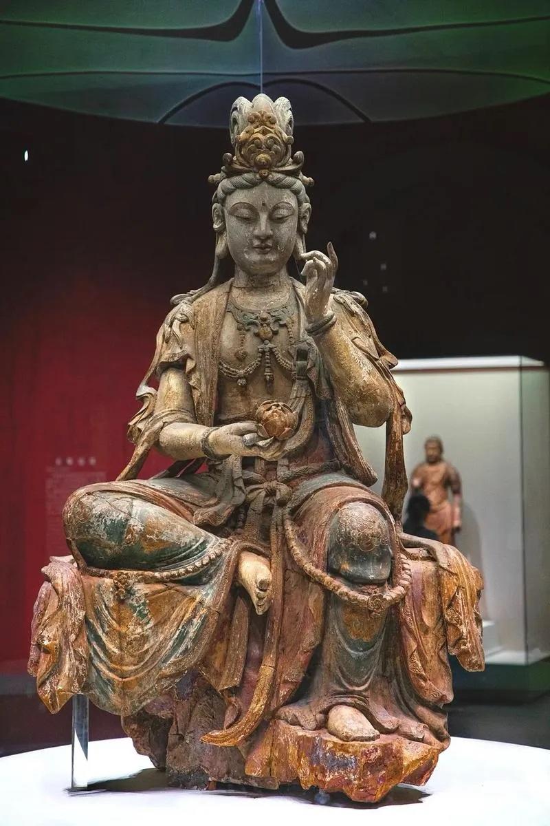 中國國家博物館中國古代佛造像展廳中,有一座高達2米的宋代木雕觀音坐像,以裸展的方式給人以巨大的視覺衝擊