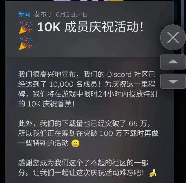 上週為了慶祝社區成員人數突破十萬,遊戲就推出了一種名為“10K”的紀念香蕉,掉落的時間只有24小時:
