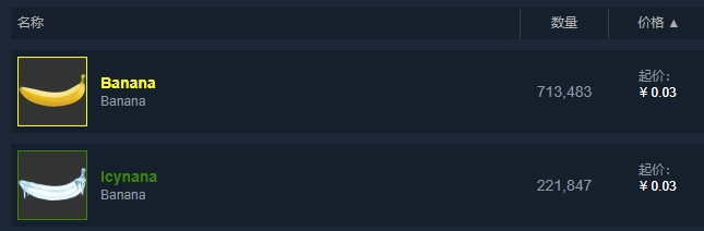 目前一根賣方售價0.03元的香蕉,在Steam市場上的價格要被標到0.05元,看似只多了兩分錢,但相對售價來説,漲幅已經達到了66.7%,而這種最廉價的香蕉,其存貨量和交易量往往也是最大的:
