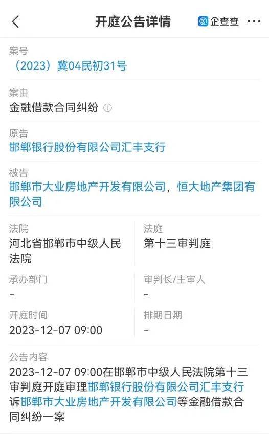 同樣據企查查信息,早在2022年,邯鄲銀行滙豐支行就在廣州市中級法院起訴了邯鄲大業房地產和恒大地產集團,案由同樣是金融借款糾紛。