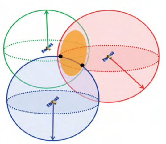 由於GNSS接收機使用導航電文中的傳輸時間和位置數據,測量衞星信號的時延,能由此計算接收機與衞星的距離,而距離某顆衞星特定距離的 GNSS接收機所有的可能位置就會構成了一個球面,當三個球面交會時就會得到兩點,而地球表面上的接收機位置就可以作為第四個數據精確定位,這也就是最基礎的三邊測量法。