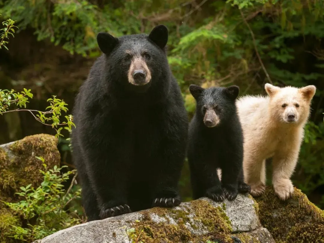 一頭雌性黑熊帶着它的兩個幼崽,其中一隻是靈熊(圖源:Pacific Wild)