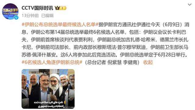 據伊朗媒體報道,一共有80人報名參加總統候選人登記,最終上述6人被確定進入最終名單。他們將在6月12日至27日舉行競選活動,28日舉行新總統選舉活動。