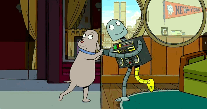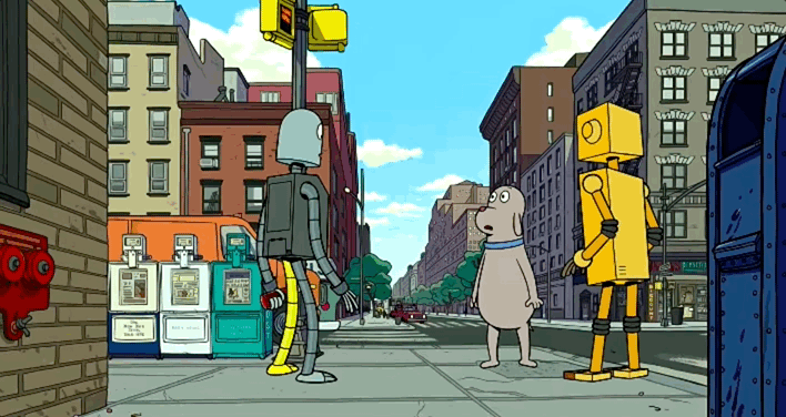 它們發現了機器人,給它喝了補充電量的飲料,重煥生機的機器人一路哼着歌回到了小狗的公寓。