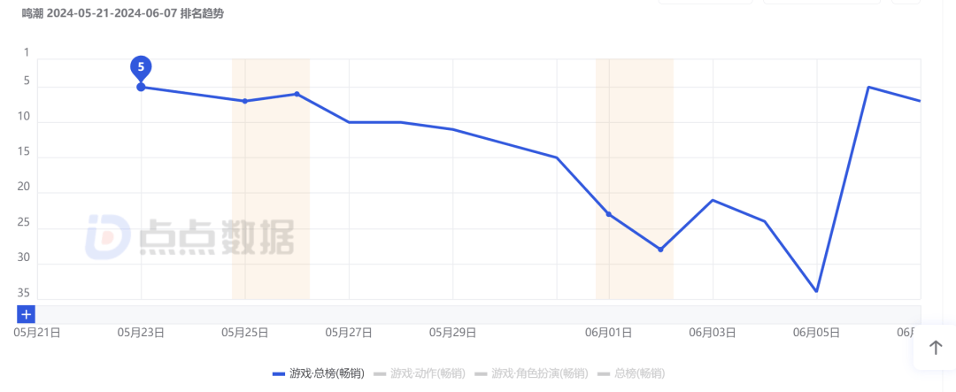 相應的,《鳴潮》首次迴歸峯值的排名為第5名,迴歸週期同樣為14天。當然,這些熱門產品的檔期、卡池情況、市場激烈程度不盡相同,比如《鳴潮》公測時碰上霸榜DNF手遊,迴歸峯值時碰上剛更新的《原神》(6月5日)……這種情況下,《鳴潮》還能跟過往熱門二遊保持類似的波動,反而更能證明它在二遊市場實現了突破性的商業成績。
