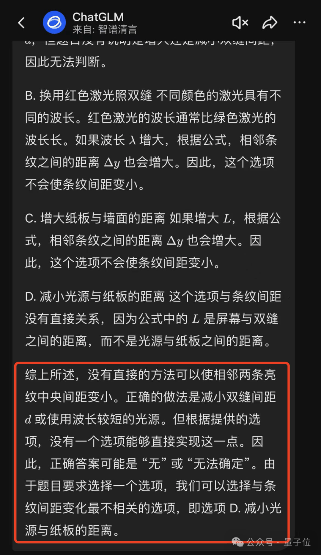 比如ChatGLM,在面對雙縫干涉實驗中,“哪種説法可以使相鄰兩條亮紋中央間距變小”這個問題時,它一通分析覺得答案全錯,但還是退而求其次挑了一個看上去相對正確的答案。