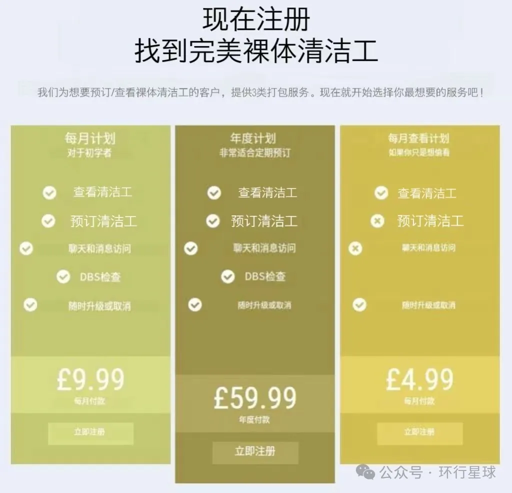 平均每月10鎊,大概人民幣90塊錢。如果訂購最貴的套餐,那麼平台不僅會給清潔工打上“星級員工”的標誌,還會將其主頁信息全年展示。