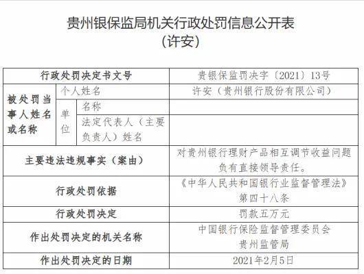 許安本人,也因對貴州銀行理財產品相互調節收益問題負有直接領導責任,被罰款5萬元。