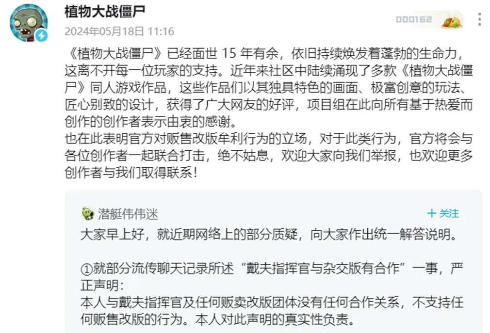 而在不久前,像“雜交版”這樣的同人作品還獲得了官方的認可, 雖然正傳的續作比較拉胯,但好在官方一直以來對PVZ的改版態度比較開放。