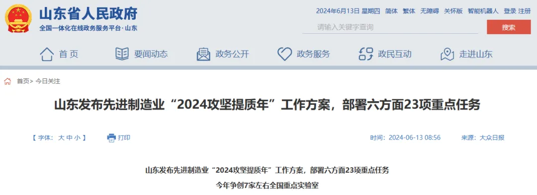 近日,山東省製造強省建設領導小組辦公室印發**《實施先進製造業“2024攻堅提質年”工作方案》**。