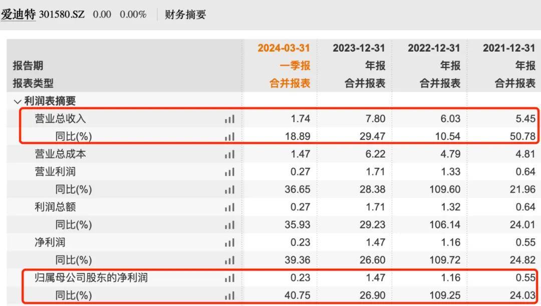 2021年-2024年一季度,愛迪特的營業收入分別為5.45億元、6.03億元、7.80億元和1.74億元,同比增長50.78%、10.54%、29.47%和18.89%;歸母淨利潤分別為5534.37萬元、1.16億元、1.47億元和2329.99萬元,同比增長24.03%、109.25%、26.90%和40.75%。